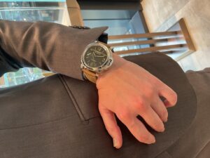 元々ストラップにはブラックのカーフベルトが付いてきますが、ブラウンのストラップを別で購入して着用しています。
