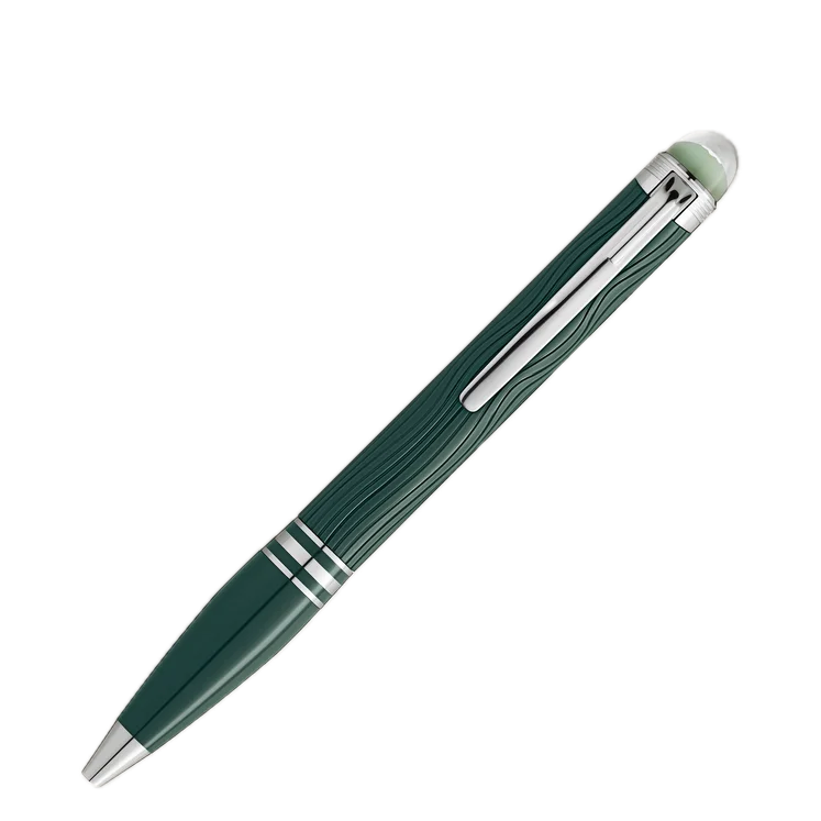 スターウォーカー ポーラーグリーンはオーロラの美しさをテーマとしています。オーロラが繰り広げる壮大なスペクタクルは、地球上の人々の視線を空へと誘い、驚きに満ちた世界へと連れ出します。透明レジンで作られたキャップトップのドームは、暗闇で発光し、夜空に舞う魅惑的なオーロラを思わせます。ダークグリーンのプレシャスレジンで作られたキャップとボディには、幻想的な光を思わせる波状の模様があしらわれ、マット仕上げがその上品な煌めきを引き立てます。首軸にあしらわれたダークグリーンのレジンリングが、プラチナ仕上げのフィッティングを引き立てます。