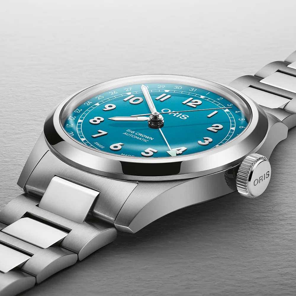 爽やかなブルーダイアルは、様々なファッションに合わせる差し色としてお勧めです。ポリッシュ仕上げとサテン仕上げのH型リンクを組み合わせたブレスレットの仕様は、オン/オフ問わず使いやすいデザインで、ブレスレットと一体型のオリス自社開発バタフライクラスプは軽やかでありつつ高級感の感じられる着け心地を提供します。